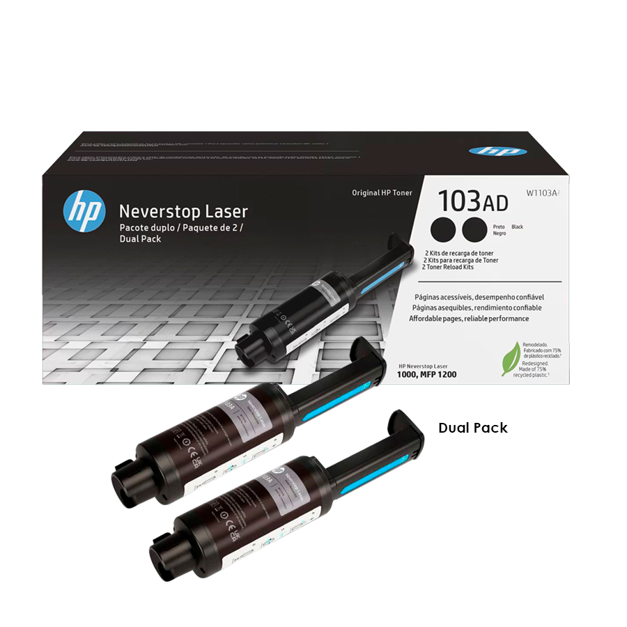 - El toner HP W1103AD (103AD) es un kit de recarga de tóner negro original de HP diseñado para las impresoras Neverstop Laser 1000 y 1200. Este kit de recarga te permite imprimir hasta 2.500 páginas a un bajo costo por página.