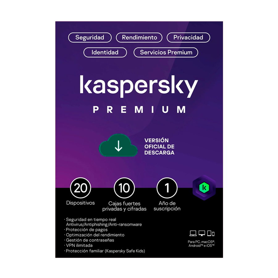Antivirus Digital Kaspersky Premium 20 Dispositivo / 10 KPM / 1 Años ESD