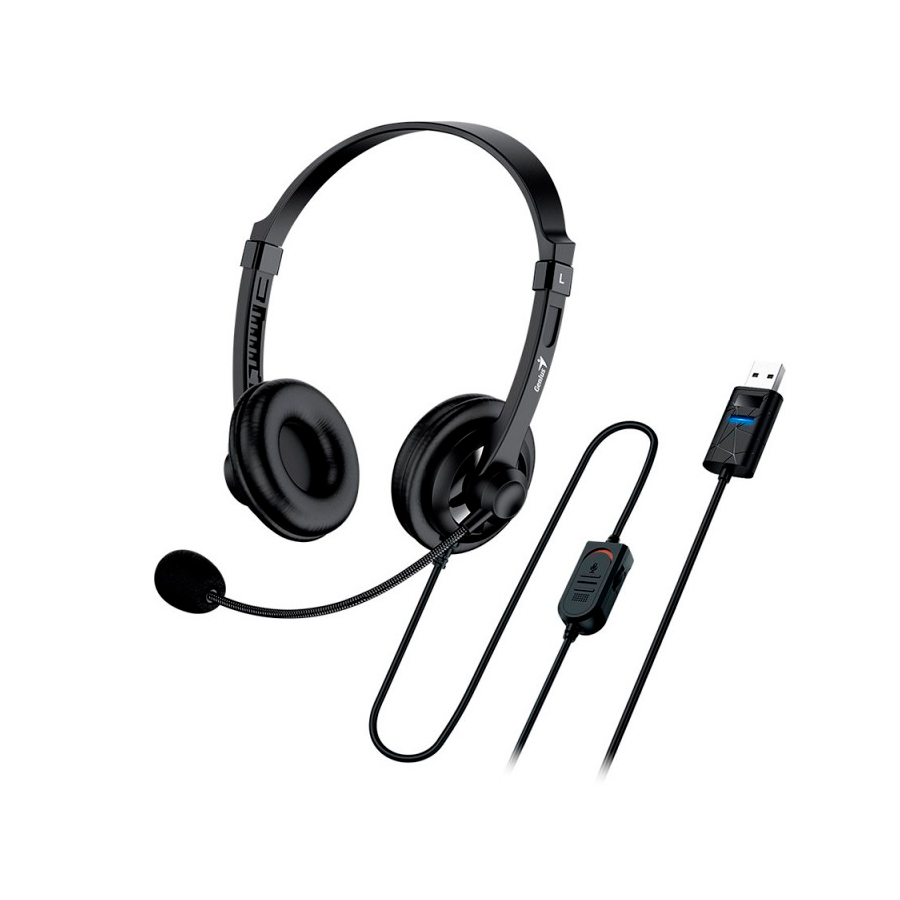 Auriculares Genius con diadema USB HS-230U en color negro, con micrófono y control de volumen. Conectividad USB para computadoras, portátiles, tablets, smartphones y reproductores de MP3.